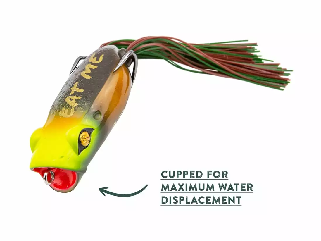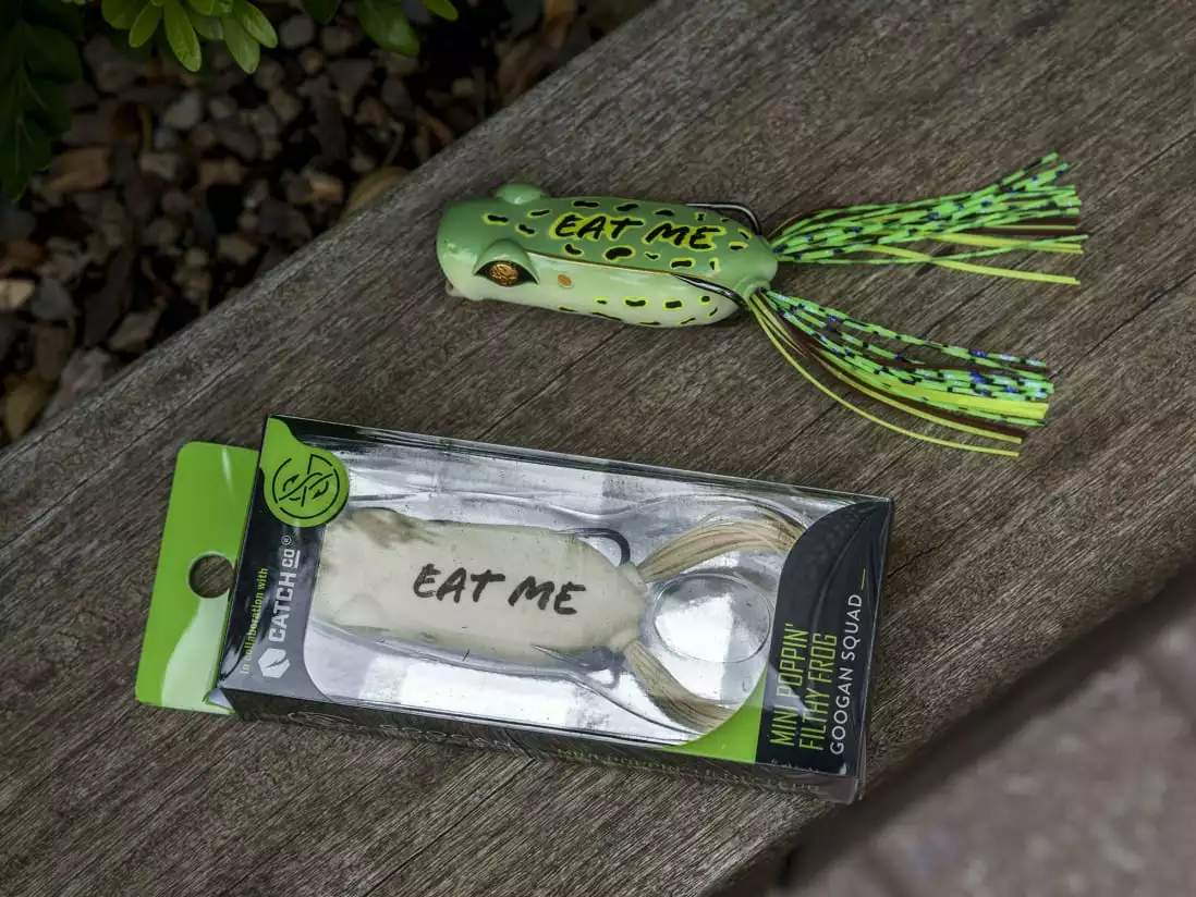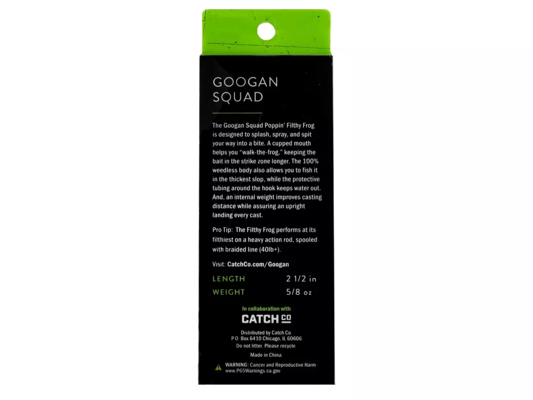 The Googan Squad Poppin’ Filthy Frog is designed to splash, spray and spit your way into a bite. The 100% weedless body also allows you to fish it in the thickest slop, while the protective tubing around the hook keeps water out. And, an internal weight improves casting distance while assuring upright landing every cast.